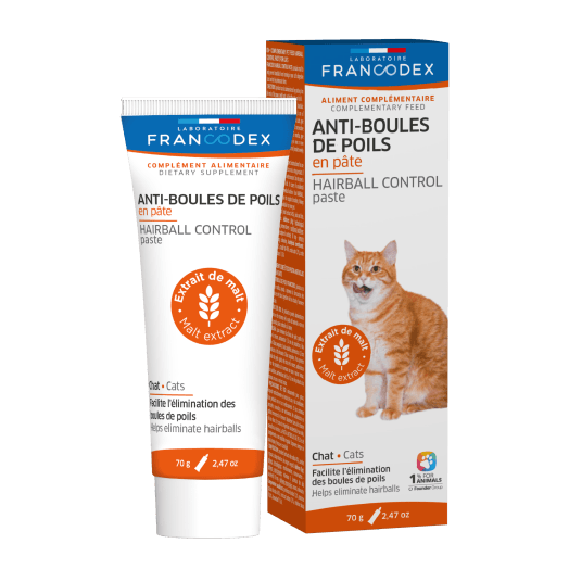 Η πάστα Francodex Hairball Control περιέχει βύνη για να βοηθήσει στην πρόληψη του σχηματισμού τριχόμπαλων στο πεπτικό σύστημα της γάτας σας και να βοηθήσει στην εξάλειψή τους.